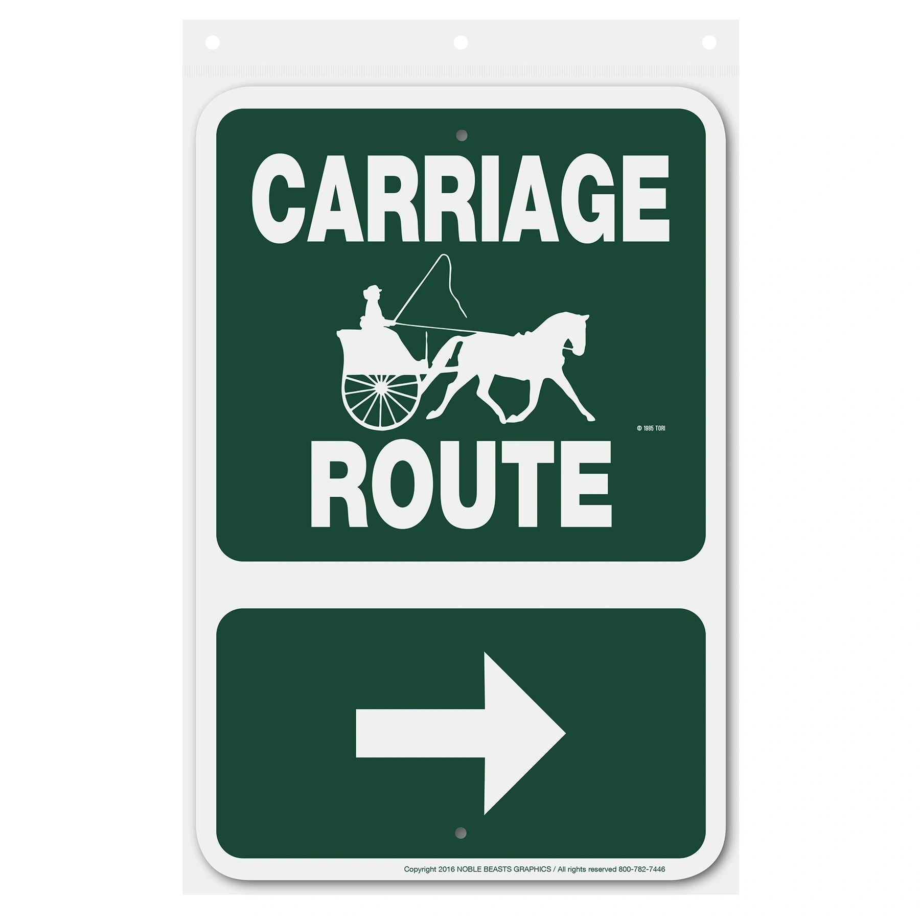 Keep people informed and aware with Noble Beasts Graphics 12 inch x 18 inch Carriage Route (Arrow Right) aluminum sign. Ideal for both outdoor and indoor use, it’s designed to be durable, weather-resistant, and long-lasting.