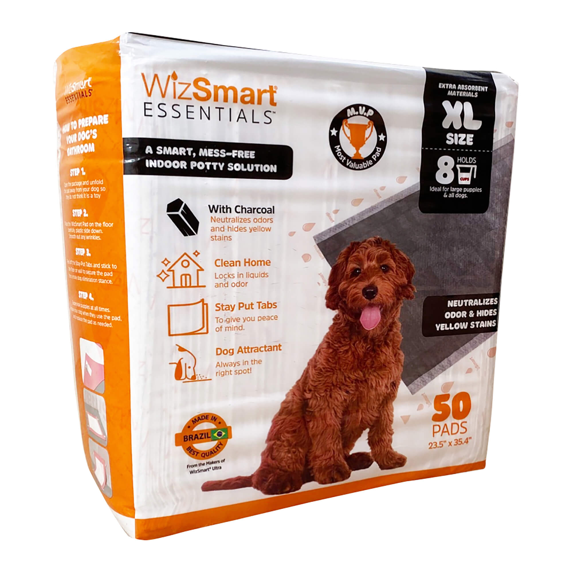 WizSmart Essentials Pads with Charcoal are our largest size, offering an extra-large absorption area perfect for large puppies and at-home dogs. The charcoal layer instantly neutralizes odors and hides unsightly urine stains, while the adaptive technology turns liquid into gel for superior absorption. These pads have an 18% larger absorbent area than other pads and feature four "stay-put" tabs to keep them securely in place. WizSmart Essentials pads are sustainably made, using upcycled super-absorbent materials and Eucafluff for an eco-friendly solution to indoor pet care.